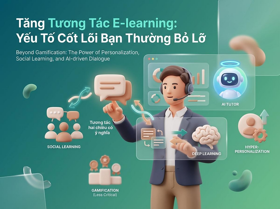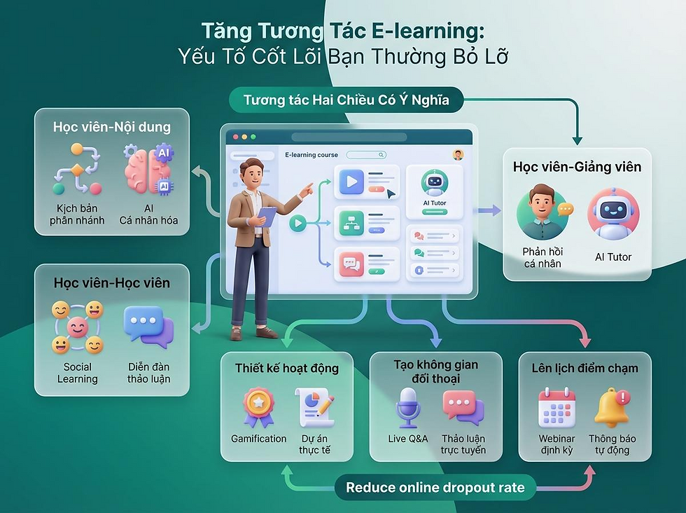 Tăng tương tác trong khóa học e-learning không phụ thuộc vào việc bạn có bao nhiêu công nghệ hiện đại, mà nằm ở việc bạn thấu hiểu tâm lý người học đến mức nào. Hãy nhớ rằng: Gamification là gia vị, nội dung đẹp là vỏ bọc, nhưng tương tác hai chiều có ý nghĩa mới chính là "linh hồn" giữ chân học viên ở lại đến phút cuối cùng.