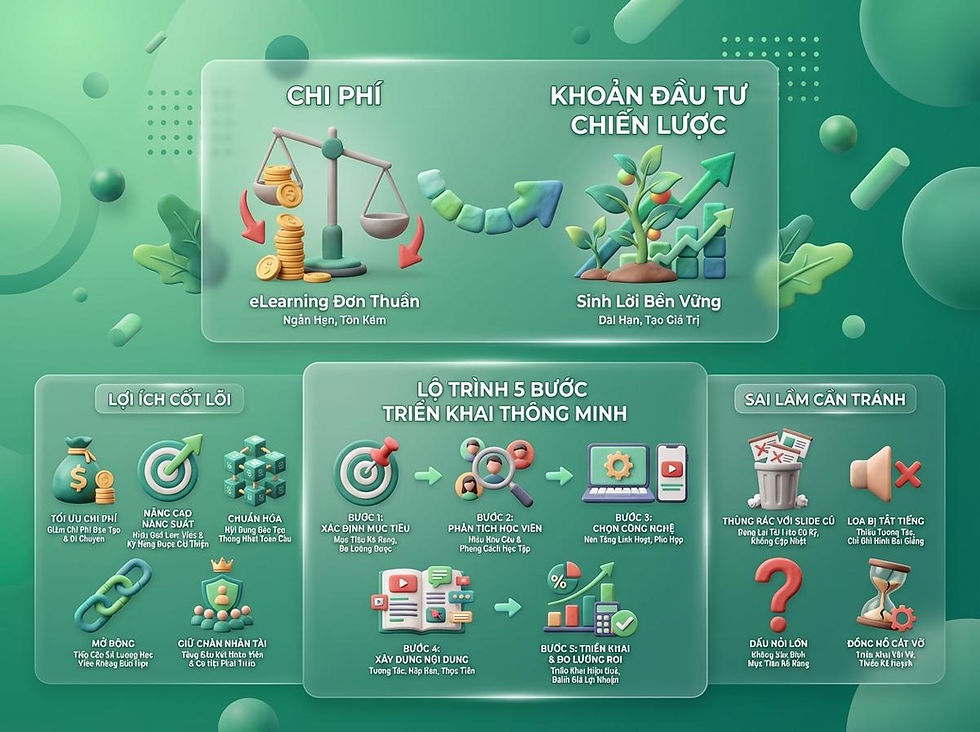 Thay đổi lăng kính từ "chi tiêu" sang "đầu tư" là bước đầu tiên để nhận ra giá trị thực sự của eLearning. Đây không phải là khoản chi phí vận hành bị cắt giảm khi ngân sách eo hẹp, mà là một tài sản chiến lược mang lại lợi ích kinh doanh có thể đo lường được.
